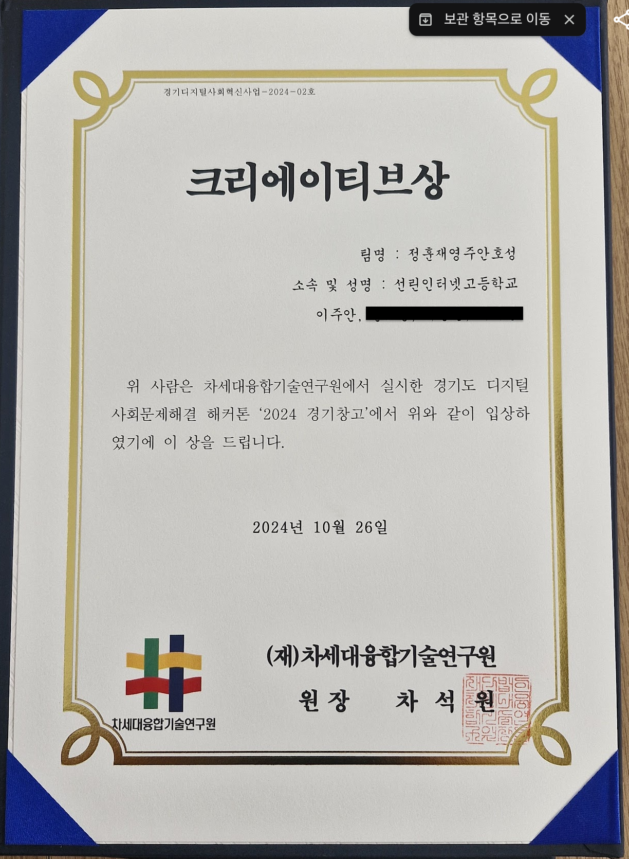 전체적으로 아쉬움이 많이 남는 대회였습니다. 본선, 결선 일정이 계속 미뤄지면서 기존 개발자 팀원들이 코드페어 일정과 겹쳐 개발에 참여하지 못하게 되었고, 결국 혼자 프론트엔드, 백엔드, AI 부분을 모두 개발하게 되었습니다. 일정이 미뤄지지 않았다면 더 나은 결과가 있었을까 하는 아쉬움이 남습니다. 또한, 대회 운영사 측에도 아쉬움이 상당히 많았습니다. 운영사 측과 소통이 원활하지 않은 것이 조금 불편했었습니다. 그래도 첫 교외 대회 수상인 만큼 뿌듯한 마음에 제일 컸습니다. 마지막으로, 이 대회를 통해 디미고, 신일고를 포함한 여러 학교의 개발자들과 교류할 수 있었던 점이 이 대회에서 가장 좋았던 점이였습니다. 2025 제 4회 경기창고가 개최된다면 모두 유종의 미를 거둘 수 있길 바라며 글 마치겠습니다.