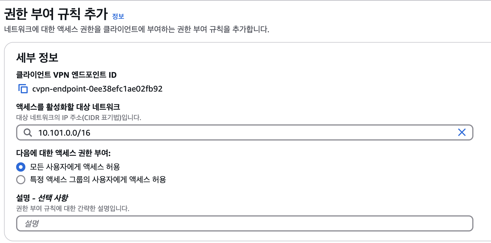필자의 경우 모든 사용자가 전체 VPC 대역을 이용할 수 있도록 하였지만, 이 설정은 원하는 대로 설정해도 됩니다.