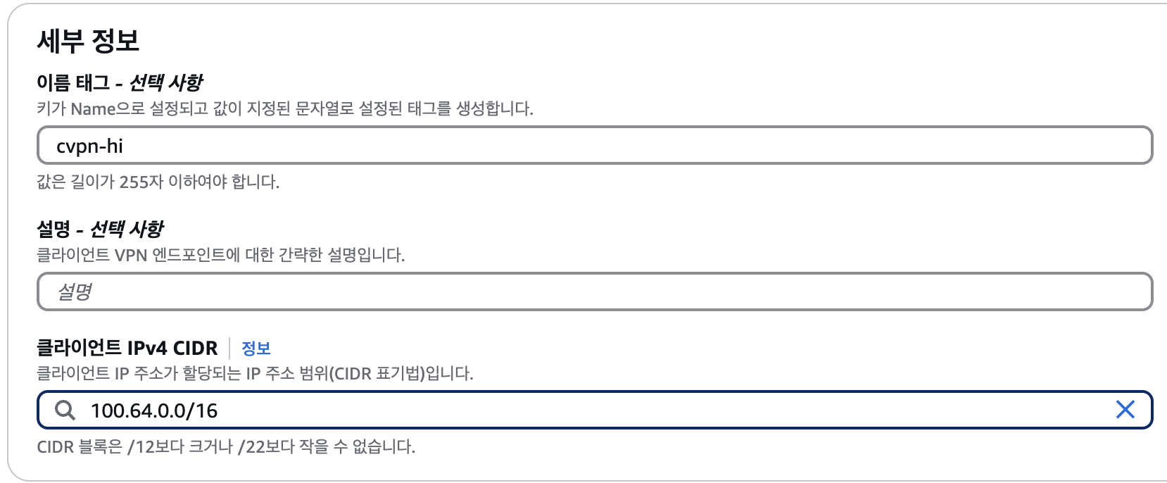 기본적으로 VPN의 IPv4 CIDR은 100.64.0.0/10으로 하지만, 이번에는 마스크를 16으로 두도록 하겠습니다.