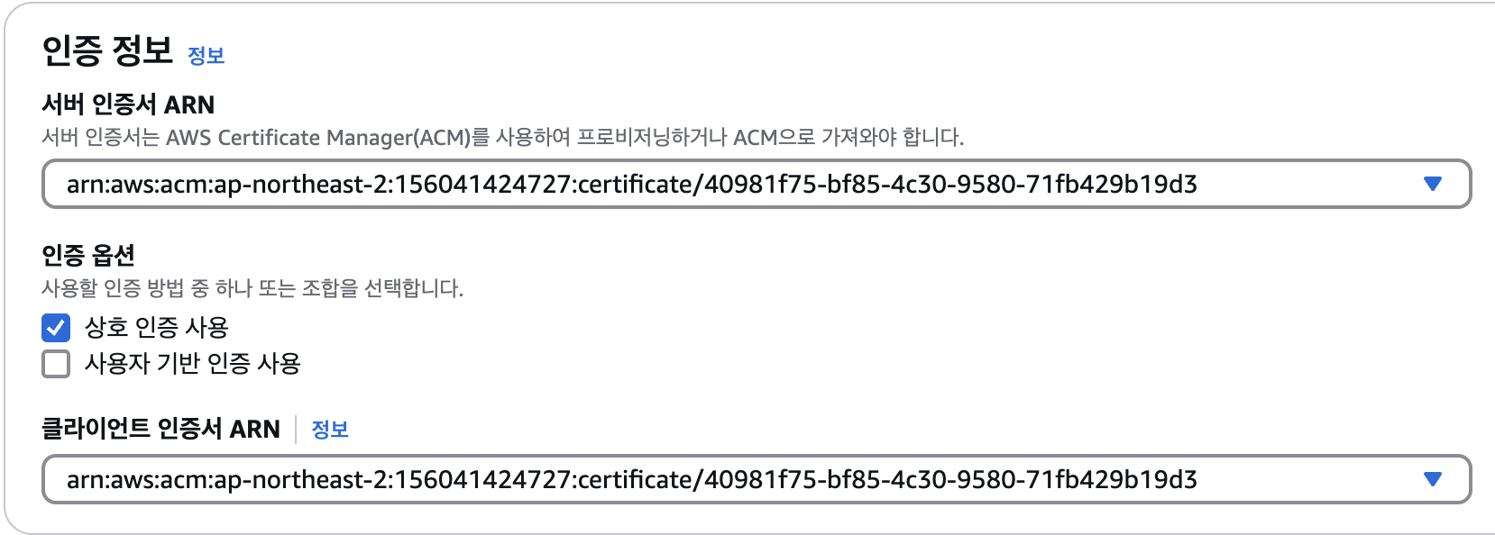 - 인증 정보는 상호 인증 사용으로 하고, 서버와 클라이언트 인증서를 각각 매핑해줍니다.