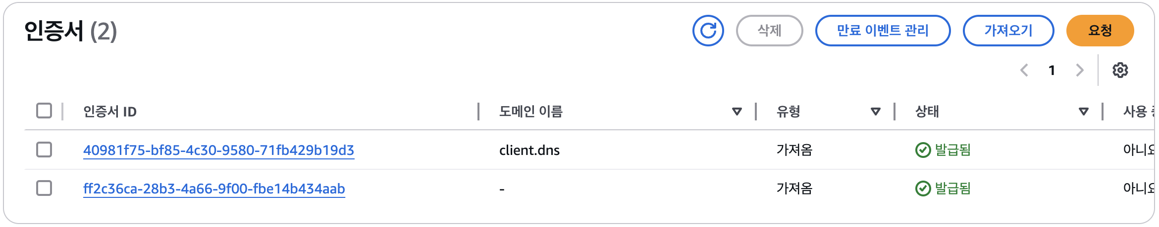 ACM에 아래와 같이 인증서 2개가 잘 뜬다면, 정상적으로 진행한 것입니다.