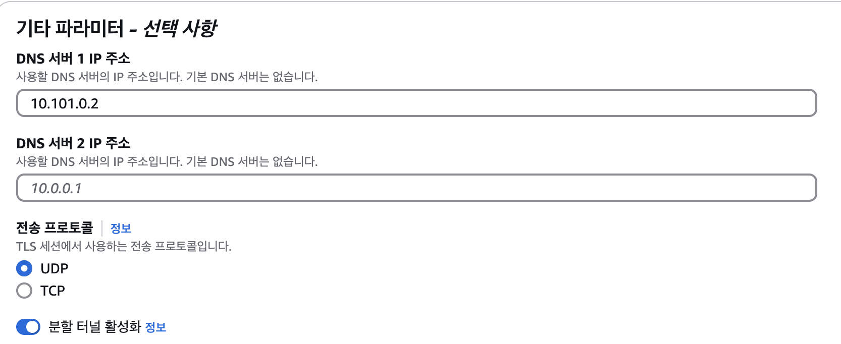 아까 설정해준 VPC의 서브넷을 Primary DNS로 설정합니다. 단, 맨 끝은 2로 해야합니다.